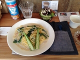 水曜カフェのメニューは豆乳パスタ優しい味ですレシピ玉ねぎとほうれん草、きのこを炒めるにんにく、ブイヨン、醤油、塩、こしょうを加え豆乳を加えるパスタと絡めて出来上がり大塚チルド食品ファンサイトファンサイト参加中 続きを見る ['close']