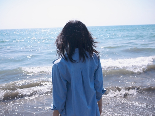 きらめく波とそれを見つめる後ろ姿が透明感にあふれ快い瞬間でした