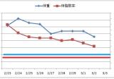 服部ヘルシーダイエット HATTORIヘルシーダイエット の1週間チャレンジもあと2日です 体脂肪はじりじりと減っているものの体重はこの3日変わらずで、気持ちは少し焦っています 焦ったってしょうがないのだけどね 毎日HATTORIヘルシーダイエット を朝、昼食べて、普段通りに生活するだけなのですが(^o^;) では6日目の朝食です: ウコンと黒ごま入り花巻 108kcal お豆たっぷりミネストローネ 89kcal 合計197kcalです ウコンって肝臓に良いって言う、あのウコンですよね料理にも使えるなんてびっくりです そういえば昔ウコンのサプリを作っている会社の人と話をしたときに、ウコンは美容にもいいからうちの奥さんも毎日飲んでいますよ、とおっしゃっていましたもちろん服部先生はそのことをよく御存じだから花巻にもウコンを使っているんでしょうね♪ それにしてもきれいな黄色で、黒ごまもおいしそうで、食欲をそそります♡ で食べてみると、これが本当においしいです≧(´▽`)≦ ふわふわもっちりの食感に、黒ごまのプチプチはじける感じに香りウコンの味はよくわかりませんが、何も入っていない花巻に比べるとうっすらといい匂いがするので、これがウコンなのかもウコンは錠剤で呑んだことがあるけど、そういえばいったいどんな味なんだろう…?って思ったりして()ゞ もぐもぐ食べてるとだんだん花巻が甘く感じられてきました甘くておいしいなあ それになぜかこの花巻、今まで食べたのよりもちもちしているような感じがして、それもいいわあ♪ もちもち食感大好きなんですもん(^▽^) ミネストローネからはトマトスープのいい匂いが漂ってきますサラサラのスープをすくってみると底からお豆がどっさり出てきました金時豆とひよこマメですねホクホクしてます(^∇^) トマトの酸味とうまみが感じられてニンニクのいい香りもするさらさらスープですが、挽肉と人参の小さいのもたくさん入っていて、スプーンですくうと必ず挽肉と人参が入っていて、それが口いっぱいに広がっておいしいです しかも挽肉はよく噛んで食べるから、一見少なく見えるスープなのだけど、食べ終わる頃には満足感とともに満腹になっているんですよね(´∀`) これ、キャベツでしょうか↓ 大胆な大きさです(ノ゚ο゚)ノ 味が中までしみこんでいて、しゃきしゃきした歯ごたえがあって、このキャベツおいしいです♪ 昼食は: 押麦粥 97kcal おからハンバーグ 98kcal 合計195kcalです おからハンバーグをレンジにかけていると和風のいい匂いがしてきましたご飯が欲しくなるような匂いです ハンバーグはダイエット中には嬉しいメニューよね、普通食べられないもんね、などと思いながらお皿に開けて見ましたら、なんだか豆腐みたいΣ(~∀~||;) あれっ? 普通おからハンバーグと言えば、挽肉におからを混ぜて、でもおからが入っているのが分からないような作り方をするものだと思っていたけど、これは本当におからだけで作ったハンバーグみたいでお肉の痕跡は見当たりません 原材料表示を見てみると、鶏肉って書いてあるのですが、よくわかりません見た目が真っ白なもので()ゞ 食べてみると、やはり鶏というよりおからです で、それだけだとぼそっとしている感じなのだけど、それをきのこ類たっぷりのソースと一緒に食べると、精進料理みたいな、奥深い味わいを感じるんですよねきのこからは良いだしが出るのかな? きのこのソースにはサクサクしたくわいが入っていて、それがアクセントになって面白いし、おいしいですよ♪ お粥は相変わらずおいしいですどんどんイケます 柔らかいお粥の中にある、押麦のコロッとした食感が楽しいです(^∇^) お粥の量はたっぷりあって、今日は特に多いなあって感じたのだけど、おからハンバーグのせいかも、って思いました おからは食物繊維がたくさんあるから、よく噛んでゆっくり食べているうちにすごく満腹感を感じたのかな、と それでお粥も食べきれないくらいに感じたのかな、って思ったのです 満足です(∀) 日課のウォーキングは 昨日は朝から小ぶりの雨でウォーキングは無理かもと思ってたのだけど、夕方近くに雨が止んでいるのに気がついて、それから近所を一周してきました 歩いている途中でまた雨が降りそうになってあわてて帰ってきたから、これくらいの数字になっちゃいました 雨の日によく頑張ったと自分をほめてあげたいわ(^^) ほめられて伸びるタイプです♪ 昨日の夜、計った体重と体脂肪率は: 体重 前日比 マイナス0.4kg 体脂肪率前日比 マイナス0.6% です う、動いた!ついに動いた!体重も体脂肪も減っています((((((ノ゚⊿゚)ノ うれしい(ノ◇≦) でもねえ、また反動とか停滞とかがあるかもしれないから、あんまりはしゃぎすぎないようにしようっと コツコツと、今まで通りの生活を続けます(`ω´)ゞ エクセルで作ったグラフは縦軸の数字を消しててわかりにくいですが、目安として載せています 下に引いた青い線が体重の目標で、赤い線が体脂肪率の目標です 体重は左の