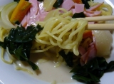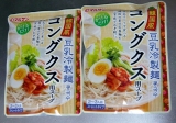 豆乳でおなじみのマルサンアイ株式会社より、春の話題の新製品、 マルサン 韓国風豆乳冷製麺コングクス用スープ をモニターさせていただきました コングクスとは、韓国料理の夏の定番麺メニューなのだそうです 豆乳で作ったスープで、暑い夏場を乗り切るのにも欠かせない食べ物なのですって いろんな韓国料理が日本に紹介されているけど、これは知りませんでした(^ε^) 食べ方の提案としては、素麺をゆでて、キュウリ、レタス、卵、ハム、キムチなどを乗せて、そこにコングクス用スープを冷たいまま入れるだけの簡単さです つまり、冷やし中華の代わりに素麺を使い、キムチを乗せるところが韓国風であるものの、ほとんど冷やし中華って感じなのね♪ どんな風でも自分の好きに作れそうな感じがしたので、わたしは中華麺を使い、わかめやハム、玉ねぎなど、冷蔵庫にあった食材を使って作ってみました お皿に麺などを盛り付けたら、その上からスープをまわしかけます スープはクリーム色で、味は豆乳というよりはゴマの風味が強いです スープをまわしかけた時にゴマの粒々がたくさん出てきましたハムの上にもたくさんあるのが分かりますか? わたしね、ごま豆腐が大好きなのだけど、このスープの味はごま豆腐に似ているなあって感じました ごまのコクがすごくあって、豆乳の独特のニオイというか味はほとんど感じなくて、ただまろやかな優しい味わいって感じです この味好きですo(^▽^)o スープをまわしかけるだけだから作るのも簡単だし、ご飯にかけて冷たい雑炊にもできるし、1袋あると便利ですね 夏になってソーメンを食べるようになれば、もっと便利さを感じるんじゃないかな いつも同じ味ばかりだと飽きるから、時々ごま豆腐味で食べるとかね ごま豆腐じゃなくてコングクス、です 今年流行ったりして(´∀`) ひとつ上の豆乳マルサンファンサイトファンサイト参加中 続きを見る ['close']