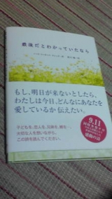 今日は最近気になった本を紹介します この本は、アメリカで起きた同時多発テロの後に話題になったものだそうです 今年起きた東日本大震災や台風被害に合った日本の人々にも、もう一度伝えたい詩だなと思いました 私の住む地域では、本当に運良く何の被害も無く今日まで過ごしてくることができました しかし、一歩間違えば今この命は無かったかもしれません 私の大切な人は、この場にいなくなってしまっていたかもしれません もし、それがわかっていたなら、もっともっと愛を伝えたのに… もし、それがわかっていたなら、もっともっと抱きしめ続けていたのに… 大切な夫や生まれたばかりの娘、実家の家族を思いながら読みました 「明日は誰にも約束されていない」 だからこそ、毎日を素直に悔いの無いように生き、大切な周囲の人たちに愛を伝え続けていきたいと思いました 子どもを持ち、命の重さをより実感している今の私だからこそ、胸に響く言葉が多かったです 未曾有の大災害に生き残った私たちは、もう一度生き方を考え直す必要があると感じました 気になった方はこちらから ↓↓ サンクチュアリ出版 友友会ファンサイト応援中 続きを見る ['close']