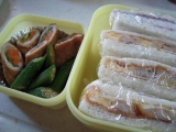 昨日の娘のお弁当ですたまにサンドイッチ私は毎日ご飯べさせたいのだけど、矯正器具にご飯粒が詰まるので毎日ご飯は嫌だとおっしゃるので今の時期