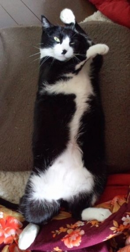 コタツで暖まり過ぎてクールダウンに飼い主の座椅子を占領して毛づくろいしています