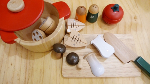 これは、木のおもちゃのおままごと 切ったり、煮たりと一緒に遊んでいるうちに、可愛いしいたけが大好きになりました