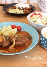 昨日のランチはハンバーグでした 3種類のきのこたっぷりソースのハンバーグ 夫用にはチーズ&目玉焼きののせてボリュームア