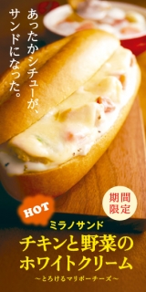 期間限定新商品「ホットミラノサンド」★第12弾★無料モニター200名大募集!!もう2012年も9日たちましたが…あけましておめでとうございまヽ(゚∀゚)ノ す!!!!さてさて!!新年から素晴らしい企画を発見しましたよ( ^ω^ )ドトールコーヒーより…『あったかシチューが、サンドになった!』あつあつ&とろりのミラノサンド『ホットミラノサンド チキンと野菜のホワイトソースとろけるマリボーチーズ』のご紹介です!!今回のミラノサンド…あったかいシチューのイメージだそうです\(^o^)/画像からとろり感がめっちゃ伝わってきてますw紹介文より…チキンと野菜を加えたクリーミーなホワイトソースに、デンマーク産のマリボーチーズと、イタリア産のパルミジャーノレジャーノの口当たりのよい2種類のとろけるチーズをトッピング!!画像だけだとホワイトソース強めなイメージだけど、結構チーズも効いてそうです\(^o^)/シチューだとサンドした時に垂れちゃって食べづらそう…と思いましたが、チーズのおかげでもったり感がでてそんなに具が垂れてこないようになってるのかな(゚Д゚)??前回のホットミラノサンド(煮込みハンバーグのやつ)も食べる前は「食べづらそう」と思ってたけど…実際に食べたら具がこぼれることもなく食べやすかったな(^ω^)手も思ったより汚れなかったよ(`ω´)!!今回も食べやすさが気になるかも…それと1番気になるのは、やっぱりお味!!ホワイトソースだけならなんとなくイメージわくけど…それにプラスしてチーズが加わることでどんなパンチを生み出しているんだろうか…(´∀`)とっても気になります!!あとあと!!紹介文にこんな注意書きが…!!※本商品は特性上、お召し上がりの際、火傷にご注意ください…(゚Д゚)!!ベリーホットやないかい…(゚Д゚)!!!!!…ってことで猫舌さんはお気をつけくださいw今回紹介した『ホットミラノサンド チキンと野菜のホワイトソースとろけるマリボーチーズ』は1月12日(木)より販売されます(´ω`)!!ドトールらぶ!!ドトールコーヒーショップ季節の限定商品をチェック\(^o^)/!!ドトールコーヒーショップ季節のおすすめメニュー 続きを見る ['close']