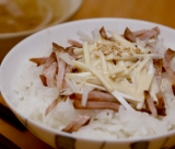 いつぞや、焼豚を使った丼を拵えてからというもの、本格焼豚を味わってみたいという欲望が募る日々 そんなところに縁あって、手作り直火焼豚(小豆島「お肉の山下屋」)を味わう機会を得た 届いたのはコレ しかも二種類! どちらも肩ロース(ブロック)を使ったもの向かって左が「カナダ産豚」<400g>右が讃岐(香川県)でお米をたべさせてのんびーり育ったという「讃岐こめ豚」<250g>それら用の特製甘タレ付という内容だ かくして、日加の豚による焼豚を食べ比べることとなったが、さてさて、結果はいかに 向こうの2枚が讃岐こめ豚のもの(以下、讃岐)こちらがカナダ産豚のもの(以下、カナダ)タレをかけてあるが、別途タレなしでも味見済み まずは、食べ比べと言っても、讃岐とカナダに甲乙とつけるものではないことをお断りしておく 小豆島は昔からお醤油の産地で有名なんだそうで、この焼豚には、その中でも有形文化財に指定されている手造り醤油を使い味付けされているとのこと 食べ方のアドバイスに、少しフライパンで焼くと美味しくなるとあったのだが、あら大変 あたたまった肉は、本来のとろとろな状態を取り戻しぷるぷると柔らかい箸で持ち上げると裂けてしまいそうだ 風味としてはカナダはクセのないカジュアルな感じ脂身もすーっと口に解ける対して讃岐は良い意味でいう獣臭さというか、そんなクセが軽くあり、私は豚ですと言っている脂はまったりと、旨味を伝えてくる肉質もカナダに比べ柔らかいようだ セットのタレは、どうだろう…自分にはちょっと甘いかなという印象どうせなら、甘辛味のほかに、生姜味とか山椒味とかバリエーションがあればいいのにと思った などと、グルメを気取っているうちに、いくらでも食べてしまいそうだとにかく美味しいので食べすぎ注意 なぜなら、他の料理に転用してみたいから 讃岐を細切りにしてネギと共に盛り付け、そこにポン酢マヨネーズ、そしてゴマをかける、焼豚丼の出来上がり(ここではタレは使わない) いちいち感想を書くのも面倒なほど、とにかく旨いいつぞや作った時に使ったハムメーカーの、焼豚とは名ばかりの醤油味ハムと比べること自体問題があるが、やはり本格な品は違う脂の風味が断然に良い 添えのオツユは鶏がらススープで細切りの讃岐とモヤシを煮たもの 実はコレ、多く作ってしまい翌朝も食べたのだが、その間に焼豚から美味しい成分が随分と出たようで、非常に旨かった でも、この丼はどうなんだろう せっかくに美味しいものは、あまり味を変えずなるべくその風味を生かしていただくべきと思った次第スライスをご飯にのせ、そこにタレをかけるだけでよいのだ 本物には人を目覚めさせる迫力があるってとこか そして あまりにお肉が旨いので、思いついてやってみたのがコレ 焼豚カツ(カナダ使用) ああ、切り方がちょっと薄い、あたしは何と貧乏性 がしかし! ここであのタレが大爆発(ほんとに爆発したら大変だけど) カツにかけたら旨いの何のってカツ、肉や脂がタレとともに一体となった、えも言われぬ味ああ何と楽しいトンカツ(薄いけど)新ジャンルの誕生か ビールが進む〜 正直、焼豚は料理材料のひとつくらいにしか思っていなかったが、とんでもない お試しでということで、材料として使わせてももらったが、この焼豚、これはこれでメインを張れる、完成された肉料理ではあるまいかと、脱帽なのだった 終 小豆島お肉の山下屋ファンサイト参加中 続きを見る