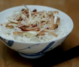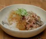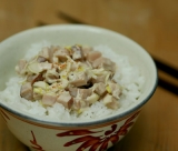 気に入って、近頃数回訪れているラーメン屋三日月 日替わりサイドメニューがいつも手書きボードで紹介されているのだが、いつぞや… 日替わり肉飯 きざんだチャーシューとネギ マヨネーズとポン酢のソースで とある それも食べれば過食になるので、遠慮しておいたがとても気になっていた (その証拠にメモってたりして) で、想像でこしらえてみた チャーシューはハムメーカーのもので、本物の風合いとはちょっと違うが、それを小さく角切りにしたものと、ネギをみじん切りにしたものソースはマヨネーズ(もちろんキューピー)に少しずつポン酢を混ぜながら溶いたものこれをたらたと上からかけた なんだか見映えビミョーだが、旨いそもそもマヨも含め、具材はご飯に合わないという理由がないこりゃ酒呑みながらでもイケますな でも、この見映えだったらプロ仕事じゃないような で、おかわり ソースは同じ材料の切り方を変えてみたまだ、こっちの方が見映えする かつ、こうすると味わいがさらりとなる気がする これが、その店のそれかどうかは分からぬが、わが家のメニューにはこれで決定!なのだった それにしても、二杯食べて、ネギ腹になった(笑) (分かるかな、この感覚) 終 【りゅうわどう最後のイベント!】新潟県のご当地ラーメン『燕三条系背脂ラーメン』 続きを見る ['close']