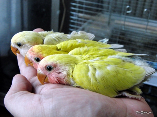 (1) コザクラインコ自家製ヒナ1号2号3号 (2) 孵化後約1か月 (3) 性別不明 (4) しさん (5) 挿餌を食べてお腹いっぱい私の手の上で落ち着いてしまいましたこうなると動くに動けず、1時間ほど何もできなくなってしまいます