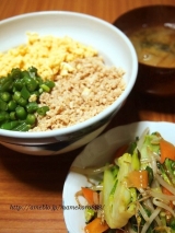今日は昨日寝るのが遅かったせいか起きるのが辛く、起きてからもフラフラした状態朝早くから栄養ドリンクを一気飲みし、洗濯機を回していたのですが…4回目の洗濯を終えた時に、洗濯物が脱水されていない事に気づきおかしいなと思いつつ脱水をかけてみるもののやっぱり洗濯物はビチョビチョ昨日から怪しい音が脱水の時にしてたんですが(ギギギギギギギギギ!!!!!!!てな音)、脱水の回転スピードがものすごく遅くて脱水されていない模様修理を頼むも水曜日にならないと来てくれないので、明日と明後日はコインランドリー行き決定!あぁめんどくさいな(T_T) 朝からの疲れも取れないし、晩ごはんを作るのも気力が湧かないので簡単にそぼろ丼にしました(^^)どんぶりメニューならメインとサブのおかずひとつで完了するから作る方も気がラク!!鶏そぼろと卵、インゲンを細かく切ってお浸しにしたものを載せました息子がインゲンは避けてたけど、後は結構バクバク食べてたので嬉しかったな!! サブのおかずは冷蔵庫にある野菜で野菜炒めほんとうは人参の白和えを作ろうかと思っていたのですが、人参を大量に千切りする時間がなくて野菜炒めにでもいろんな野菜が食べれるからこの方がよかったかも! 電化製品って壊れ出すと一気に他のものも壊れませんか?我が家では二週間ほど前にテレビが壊れ(壊れたというかもう20年近くまえのだから仕方ないが、ちょっと振動を与えただけで液晶にヒビが入った)、買い換えたら今度はパソコンのプリンターが壊れ、そして洗濯機ともう嫌になります!お金ばっかり飛んでく(T_T)!!もうこれ以上壊れないことを祈るばかりです【テーブルマーク】冷凍食品2015春の新商品お試しランキングイベント