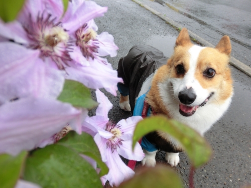 雨の日は散歩も嫌がるので遠くにはいけませんが、ちょっと回って帰ってきた家の前で咲くクレマチスを見ている光景を収めました