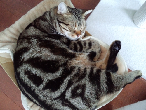 入りきれない大きさのダンボールにお気に入りのフリース横にはちゃんとしたフカフカベッドがあるんですけどね