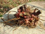 ヤーコン ですアンデス高地を原産とするキク科の植物ですサツマイモのような根の部分は食用となり、サクサクとした歯ごたえは甘味のある大根といった感じです11月頃からスーパーなどで「ヤーコン」を見かけるようになりますヤーコンはサツマイモのような形色をしていますが、皮をむくと白くてみずみずしいアクがありますが、生食もでき、味はナシのような甘みがありシャキシャキしていますイモ類のイメージとは全く違う食感に驚きますこれは、水分とフラクトオリゴ糖からなるためですフラクトオリゴ糖は、整腸作用やコレステロール、中性脂肪の低下が期待できるそうです 効 能ヤーコンは、漬物やキンピラがお勧め!すったヤーコンとオレンジジュースを合わせてもおいしいですぜひ、お試しください 【ライフサロン三鷹店】おもしろい野菜「ヤーコン」より参照成人病の予防 血糖値 血圧の気になる方に さらに血中コレステロールも低下させ、脂質代謝を改善することで動脈硬化や高血圧など成人病の防止に効果的ですまた、甘味はあっても消化吸収されないため低カロリー食品としてダイエットにもなります また、ポリフェノールの含有量も抜群ですポリフェノールをたくさんん摂取することにより体内の活性酸素を除去し老化を抑えてくれるのです動脈硬化 老人性痴呆症 脳梗塞 リウマチ性疾患 心筋梗塞痛風 糖尿病 ガンの予防などにも効果が見られます体の健康が気になる方やシミやソバカス、老化による美容が気になる人にもポリフェノールはおすすめです食べ方いろいろ自家用にお茶も作ってみましたヤーコンの葉を陰干して手でもみ、紅茶やウーロン茶とブレンドすると飲みやすいようです若葉を天ぷらにしても良いと聞いています生芋は洗うときワイヤーブラシでこすると表面の皮がむけて、無駄が少ないと思います千切りにして人参やピーマンなど色合いの良いものと合わせ、キンピラにすると色合いもよくおいしいですまた、人参、ヤーコン、じゃこでかき揚にしてみたら、好評でした味噌汁、ぬか漬等、工夫次第で用途は多彩です甘味があるので砂糖は加えずに調理するのが無難ですしゃきしゃきとした歯ごたえを生かせる料理であれば、多様な献立に応用できます 栽培方法 当農園は 完全無農薬 有機栽培春の暖かさを感じるころがヤーコン植え付けの時期になります あまり早く植えて遅霜にかかっても被害がでてしまいます 植え付けはヤーコンの株から芽を23芽単位に切り分けて45cmの深さに植えますそれには次の二つの方法があります① ビニールハウス等に3月下旬4月初旬ころポット植えし4月下旬に本植えする② 遅霜のおそれがなくなったころ 最初から畑に直接植える注意点日当たりの良い場所を選ぶ連作でも良いとされているが 長年の連作は避けた方が良い、畝は芋を掘りやすくするため高くする 畝の間隔は草丈が大きくなることを考えて 幅90cm以上とし 植える間隔は50以上とする 夏の草取りは重労働なので7月頃までは マルチングするとよい 肥料は堆肥をいれ有機肥料で育てたい、 8月から9月初めに追肥を施す霜の降りない11月初めのうちにお茶にする葉の収穫をする続いて芋の収穫をする (掘るときは道具を使うと痛めてしまうので引き抜いた方が良い)サツマイモと同じ要領で畑に穴を掘り 芋 種芽を保存する以上ですが、いかがですか?今年の作物のリストに入りますか? 老人性痴呆症に聞くのならそろそろ必要になりそうなので植えてみようかな 購入先は サカタのタネ オンラインショップにて 販売価格 ¥1,800(税込) 植えつけ時期 45月 送料 ¥400 お届け 9cmポット 友の会割引 友の会割引対象 耐寒性 弱 注文締切 2012年04月20日 収穫時期 1011月 お届け時期 2012年5月上中旬 日照 日なた とありました、参考にしてください 続きを見る