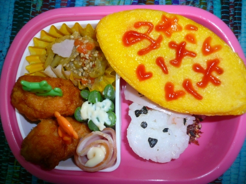 最近、お弁当に文字を書いてひらがなを読めるように練習をしていますその第一弾が自分の名前から!ケチャップペンはとっても書きやすいので、小さなオムレツにも名前と模様までかけましたそのおかげで毎日なんて書いてあるかお弁当を見るのが楽しみだそうです