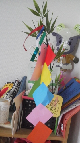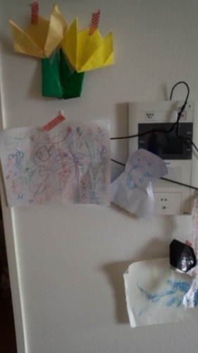 遠足が晴れるようにてるてる坊主と折紙のチューリップは4歳の娘がお絵かきは2歳の息子がしました 二人ともお絵かき、工作大好きです!!
