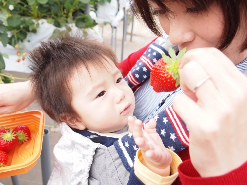 はじめてのイチゴ狩りに行ったときの写真です 真っ赤でおっきないちごに興味津々!!