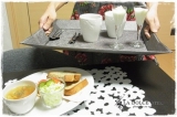 お食事の時やお友達が遊びに来てくれてお茶を出す時など、 "トレイがあるといいなぁ"って思うことが結構あります… トレイを探していたのですが、収納場所を考えるとなかなか購入出来なかったのですが、とっても素敵な商品をみつけました ルノーブルさんのプレースマットトレイ トレイとしてもランチョンマットとしても使えちゃう優れモノなのです さっそく先日夫にもらったゴディバのチョコでおひとりさまtea time 持つと自然に取っ手が曲がるのでトレイになるんですよ テーブルに運んで… 置いて手を離せば平らになってランチョンマットになっちゃいます そのまままったりtea time かじったらとろっといい感じにチョコが出てきたので思わずパシャリ このトレイ、とっても便利で毎日活躍してくれています 平日は私は授乳があるので朝食はバラバラなんだけど 夫一人分の朝食をここにのっけて出して、 私が食べるときにそのまま持って片付け うん、楽ちん トレイなのに平らになるから、しまう時も場所を取らないのですごくイイ 今日は休日なのでゆっくり寝てから一緒に朝食 二人分のプレートは乗りませんが、 飲み物とデザート、スプーン&フォークをトレイに乗せて 一気に運べるので便利です ちなみにこのトレイ、なんと3kgまで乗せれるらしい 塩化ビニール製で水分もはじいてくれて汚れにくいので 飲み物とかこぼしてもさっと拭くだけでOK 私のはライトブラウンですが、デザインも豊富でとってもオススメですよ 気になる方はぜひ一度HPを見てみてくださいね 本日の朝食 紅茶食パン サラダ 野菜たっぷりコンソメスープ ジャーマンポテト ヨーグルト コーヒー バナナ食パンに続いて、今回は紅茶の茶葉をいれてみたところ これがまたとってもおいしく焼きあがりました 夫、紅茶飲めないんだけど、このパンおいしいっと気に入ってくれた様子 この調子で紅茶も飲めるようになってくれたらいいのになぁと思う… ゚・。。・゚ 紅茶食パン ゚・。。・゚ 強力粉 200g 薄力粉 50g 砂糖 30g 塩 3g バター 30g 紅茶 お好きな茶葉で2p 牛乳 180cc ドライイースト 小さじ1 材料全部HBに投入して焼き色:淡、早焼きコースでスタート さてさて今日はあいにくのお天気なので おうちでまったりDVD鑑賞でもして過ごします ブランド洋食器専門店 ルノーブルファンサイト参加中 続きを見る ['close']