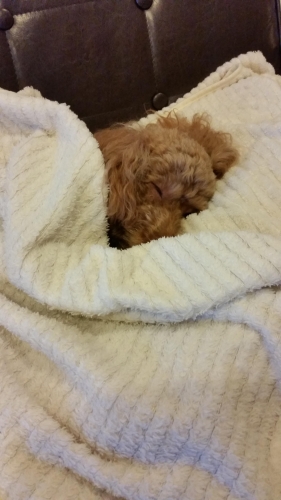 朝はいつもソファーの上でクッションを枕に、ハーフケットを掛け布団にして寝てます(>