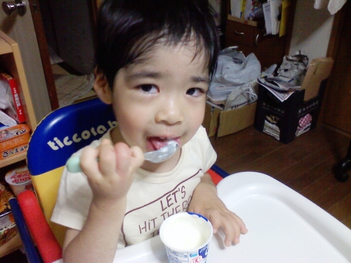 タカナシ乳業のおなかにGG!ヨーグルト 夕食後のデザートで頂きました ちょっぴり味見して… 「これ、美味しい」と笑顔に!! 食後なのに、1つペロリと食べた息子です