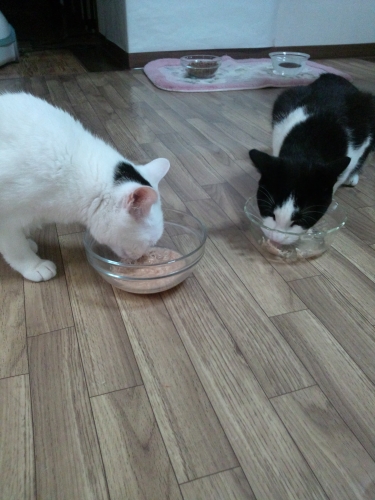 先日購入した会社のカップ入りのキャットフードは食いつきが悪かったのにねこ姫は2匹とも食いつき抜群デス1カップで2匹だいじょうぶかなと思ってたらとんでもないくろちゃんがあっという間に全部食べてしまいましたしろちゃんの分がなくなったので2個目をあけて食べさせています本当にあっというまにたいらげてしまいましたこんなに美味しそうに食べてるのを見るのはひさしぶりですよほど美味しかったのでしょう …続きを見る ['close']
