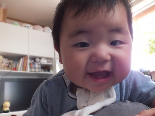 1歳になったばかりの娘は朝から元気! パパの上に乗って顔を引っ張り、たたいて、起こしてくれますw