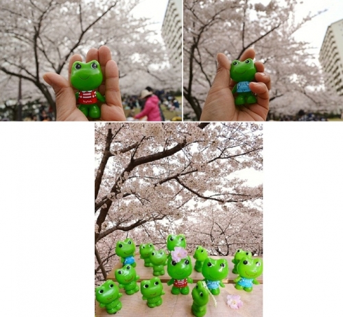 桜の花見に行ったらケロチャンコロチャン見つけたよあっ!こっちにもあっちにもみんな集まって!記念撮影撮るよ