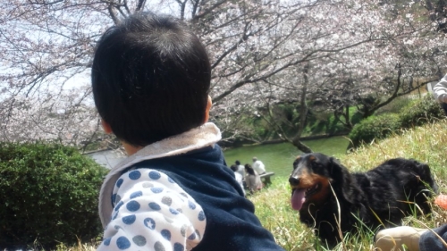 桜に見入ってる息子に対して、暖かな日差しに浮かれてるワンコ ようやく訪れた春、初めて出来た弟と走り回りたくて仕方がないみたいです