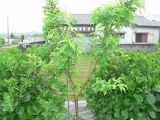 >可愛い桃です 2年目を迎える桃の白鳳です 3本の主枝で仕立てていきます自由放任三方開心型(?)でいきます 今年たくさんのきれいな、まさに濃い桃色の花が咲き、実もたくさんつけてくれました 50個以上ありましたが、全部残すわけもいかず、12個1ダースに摘果です 約30cm間隔に1個のこしました 木が幼いのでまだまだ多いのかもしれません ******************************* 白鳳です両側は紫陽花です 小さくてもさすが桃ですピンク色がみえます 桃の袋です100袋しっかり準備してあります取らぬ狸の皮算用になるかも 最後までがんばって美味しい桃に育っておくれ ******************************* … 続きを見る ['close']