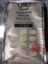 KOIKEYA PRIDE POTATO インペリアルコンソメ (湖池屋)この「KOIKEYA PRIDE POTATO」は、"素材、皮の剥き方、洗い方、揚げ方、厚さ、油の種類、仕上げなど、まるで料理を作るように"こだわり、日本産のじゃがいもを100%使用されています素材も製法も一切の妥協なく、老舗湖池屋のプライドをかけて理想のおいしさを追求した、新生湖池屋を象徴する一品だそうです