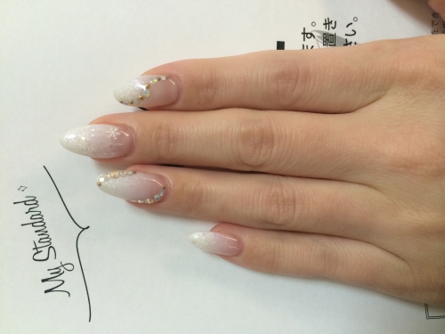 白グラにパールとラメホロを散りばめた、寒い冬でもネイルを楽しもうというデザイン