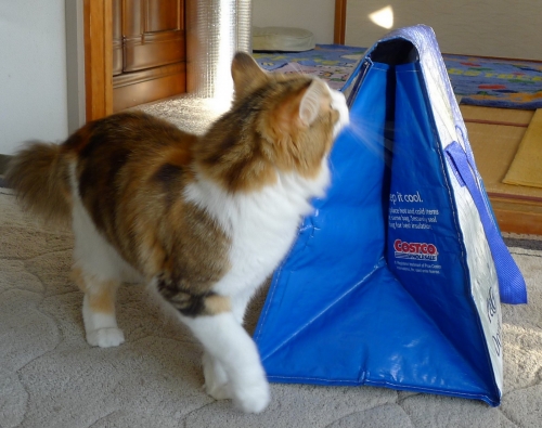 買い物袋なのに、すぐに入りたがる ふたをしたら袋は三角形、光の差し込みも三角形