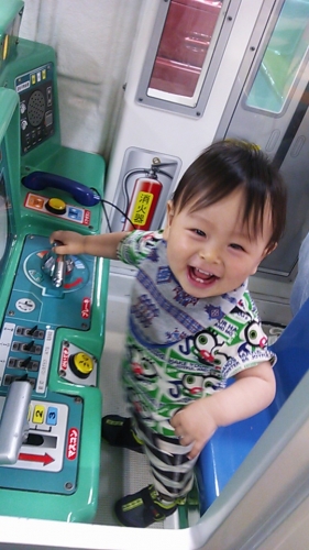 初めての電車の乗り物で大喜び♪レバーに手をかけてなりきってます