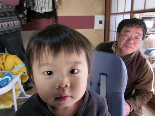 真面目顔の孫、ハニカムじいじ チャイルドシートに乗る練習をしています