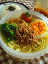 次男のお弁当です^^ ★8月24日★鳥の照り焼き、錦糸卵、ほうれん草のおひたし、ポテサラサンド イメージは大好きな大館の鶏めし弁当風 白飯だけどね^^ 作っててもテンション上がった^^ 私の分も作ったらよかったな^m^ ★8月25日★ 冷やしつけ麺(辛味噌味)、おにぎり(梅干) 初めて麺類のお弁当にしてみた 卵、メンマ、ほうれん草、トマト、ピリ辛ひき肉の具 卵は前の日の晩の肉巻きのをレンジで温めて火を通した(だからボコってる) タレは前の日にペットボトルに入れて凍らせました お昼にはちょうどよく解凍されてたみたいです♪ おにぎりは最近ごま 海苔だと蒸れて悪くなるかなと思って 早く涼しくなってくれないかな 保冷剤入れたりしてるけどお弁当、心配です *************************** 最近ハマってるモニプラの応募 ちょっとお付き合いくださいませ^^ 参加中 「グリーンスムージー×エルカフェ×ムラコレ スペシャルセット」モニター募集! http//moniplajp/bl_rd/iid8438604135032fa5077178/m50108a0e55985/k0/s0/ スムージーでダイエットもあり! **************************** 24時間テレビ、みんな頑張ってるね! 家で見て応援してるよ (募金しに行けってね^m^;) 続きを見る ['close']