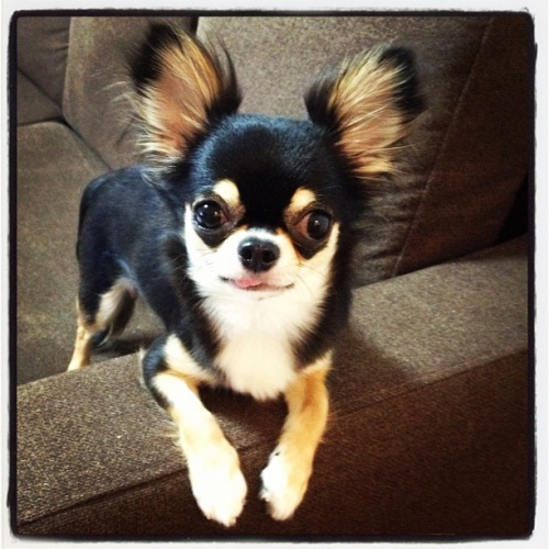 ソファーのひじかけに手をおいて