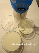 s0/" rel="nofollow">コラーゲンのニッタバイオラボファンサイト参加中今月のレッスンでも こちらの ゼラチンとアガーを使って デザートを作ってます☺去年から使い始めて かなりのお気に入り扱いやすいこちらの ニッタバイオラボ http//wwwnittabiolabcojp顆粒タイプのゼラチン 「ニューシルバー」 と粉末タイプのゼリーの素 「クールアガー」 顆粒タイプのゼラチン 「ニューシルバー」 ふやかす手間いらずでスピーディー調理 45℃程度(熱いお風呂のお湯程度)に温めた、ジュースやコーヒーに直接加えて、よくかき混ぜて溶かし、冷やし固めてくださいゼリー液200cc(1計量カップ=2人分)に対して、5g(25%)が標準的な使用量です計量の目安大さじ(15cc)すり切り1杯で約33gです粉末タイプのゼリーの素 「クールアガー」 海藻から生まれたゼリーの素固まるのは早く、常温で固まるので扱いやすく、溶けにくいゼリーが仕上がります使い方は簡単!!ダマにならないよう、あらかじめクールアガーを砂糖などの粉末材料と混ぜあわせておきます水に、粉末を撹拌しながら徐々に加え、よく分散させますかき混ぜながら中火で煮溶かします(80℃90℃)粗熱がとれたら容器に流し入れ、冷やし固めますゼリー液200cc(1計量カップ=2人分)に対して、3g(15%)が標準的な使用量です計量の目安大さじ(15cc)すり切り1杯で約6gですこちらを使って コーヒーゼリーミルクドリンクと カボチャプリンと ヨーグルトゼリーを作ってレッスンのデザートにお出ししました♪☺ヨーグルトゼリー☺*材料* 牛乳300ml プレーンヨーグルト(無糖) 300gゼラチン 「ニューシルバー」10g砂糖 60g☺1 牛乳と砂糖を鍋に入れて温め、ゼラチンを振り入れて溶かし、あら熱を取ります ☺2 かき混ぜてなめらかにしたヨーグルトをボウルに入れ、1)を混ぜます ☺3 ガラス瓶に入れて冷蔵庫へ入れます素朴なヨーグルトゼリーです♪ お口直しにいかがですか?☺濃厚かぼちゃプリン☺こちらは お家にある バターナッツかぼちゃで作ったプリンですかぼちゃ(レンジで5分程蒸したもの)300g砂糖60g 牛乳200ccゼラチン 「ニューシルバー」5gフードプロセッサーで レンジで温めたカボチャと砂糖をフードプロセッサーで混ぜてから牛乳を入れて 火にかけます その後に ゼラチンを振り入れて カラス瓶に入れて冷蔵庫で温めるだけ出す時に メープルシロップをかけました(笑) カラメルを作ってもOKそして アガーを使って作るカフェオレゼリー220ml瓶4本分【コーヒゼリー部分】Aインスタントコーヒー大1Aグラニュー糖大15Aパールアガー大1水320ml【ミルクゼリー部分】Aグラニュー糖大さじ1Aパールアガー大さじ21牛乳,320ml【カフェオレシロップ】牛乳200ml砂糖大1インスタントコーヒー小さじ1* 分量はお好みで調整してください作り方1 鍋にAをいれて混ぜ合わせる(ダマにならないポイントです)2 水を加えて鍋底から混ぜ中火にかけるふつふつしてきたら弱火にして30秒ほど加熱網じゃくしなどでこしながら耐熱容器に入れるあら熱が取れたら冷蔵庫で1時間ほど冷やす3みるくゼリーはコーヒーゼリーの水を牛乳に代えて同様の手順で作ります4 カフェオレシロップを作る耐熱容器に材料を全て入れレンジ600wで1分ほど加熱して冷ます後は好みのカップ(瓶)などにゼリーを交互に入れてカフェオレシロップを注げば出来上がりですとても 使いやすい こちらのゼラチンとアガー お勧めです♡ 続きを見る ['close']