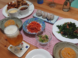 おうち居酒屋 スティックチキン 里芋フライドポテト ほうれん草とベーコンのバター炒め やみつき金時人参 柚子みそ大根 水菜のおひたし まん丸こにぎり ビール 実家の野菜 (大根、人参、ほうれん草、水菜)とおおいたクッキングアンバサダーの里芋で お野菜メインの食卓 です …続きを見る