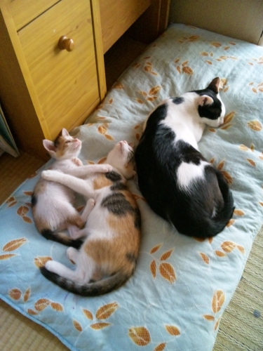 ちょび姉(白黒)が二人が来てから愛情を取られると勘違いして最初はふーふー怒ってたけどちょっとずつ慣れてきてみんなでお昼寝タイム!今はべったりみーんな仲良しです!