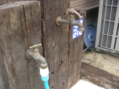 枕木を加工してスクラップの蛇口をつけてみました 水道やさんに工事はたのみました