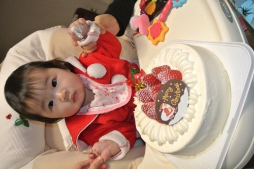 産まれて始めてのクリスマスをこの間迎えました(ω)ノまだケーキは食べれないけど、じいじとばあばがせっかくケーキを持って来てくれたので記念に写真だけ撮りましたまさかのケーキを手掴みした娘ちゃんに皆で驚きました!笑