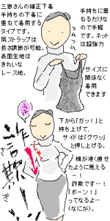 かわいい下着通販の三恵様のご好意で、補正下着吊り型をモニターさせて頂きました イラスト内でも書きましたが、詐欺ですー! 「痩せた?」って位に変わってしまいます 特にサイドー! シュッとして、すっきり! 詐欺ーーーーン! 胸肉はどんどん移動して、脇へ背中へ移動するらしいですね 「これが本当の私?」 (←たぶん違う) って思い込んで着用しようと思います ネットが超強力!! 部分によっては三重になっているらしい 吊り型花柄ブラックを送って頂いたのですが、レース地がとてもキレイ! なのにすごい圧力!!!! 胸は下から上へ! 脇肉腹肉はゼロへ! 詐欺!ってくらいに変われる、すごく楽しい変身アイテムです 続きを見る ['close']