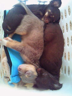 天気のいいお昼、窓際の洗濯カゴに集まり寝ていました(´ω`) 上:ナラ(チワワ)左:キアラ(チワワ)右:グッチ(チワワ)