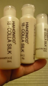 ハホニコハッピーライフファンサイト参加中 今回ハホニコ18コラシルクシリーズ シャンプートリートメントヘアオイルミニセットをモニターさせていただくことが出来ました ちゃんとしたケースに入ってたし旅行にピッタリかな 左からシャンプートリートメントヒートインオイル まずはシャンプー前のいつもの広がった毛先 結構パサパサ はい シャンプー終えてタオルドライですよ時間が経つと一本一本がウネウネ とりあえず何もつけずにドライヤーで乾かしますこれでもいつもよりまとまってます ここで初めてヒートインオイル塗布ちょっぴりね お結構ツヤツヤダメージをしっかりと補修して指どおりもなめらかなサロン帰りの髪へと導きます♪と、書いてあったのでワクワクしながら商品到着を楽しみにしていました。o゚・,。。o。o゚・,。。oさて実際に使ってみた感想をまずシャンプーなどを使う前の儀式として香りのチェック 甘ーい甘ーい香りにちょっとばかし参ってしまいました 「エレガントフローラルの香り」だそうです 湯気の立った浴室に充満します わたくし的には甘い匂いは合わないかなっとでも大概の女性にはウケそうです髪をまんべんなく濡らしシャンプー塗布 「洗うたびに補修する美容液シャンプー」 黄みを帯びた透明なサラッとした液体です 手のひらに広げやさしく泡立てていくと結構なめらかですね 指通りバツグン このシャンプーは洗っても必要なものは摂りすぎない残してくれると言う事?らしいです コラーゲン成分シルク成分配合のシャンプーです シャンプーのすすぎっていっつも毛先が引っ掛かってイライラ ところがこのシャンプーすすいでる最中からひっかかりが全くない まるでいつものトリートメントが終わった状態のようですお次はトリートメント 「毎日がサロントリートメントの仕上がり」 ボトルに入ったクリーム状のトリートメント 最初はすぐ出るけどボトルって最後まで使いずらいんですよね ん残念 しかしトリートメントそのものはほんといいです 常にするする指が動くからちょっと嬉しかったよ すすぎ終わって髪の水分を手で絞るとき髪のボリュームが いつもと全然違った ドライ後のまとまりが想像できましたそして最後は洗い流さないトリートメント 「濡れた髪にも乾いた紙にも 極上のツヤ髪へ」 今回はドライヤーで乾かした後でヒートインオイルをつけたけど タオルドライ後の濡れた髪でもOK 私的にはもう少しサラッとしてくれると嬉しいんだけどね 乾いた髪に付けてみたけどなんとなくペタッとした感じで好きじゃないですね 今度は濡れ髪に付けてみよっと 少しは馴染むかもね ツヤは出ました詳しいことは下をクリック 続きを見る ['close']