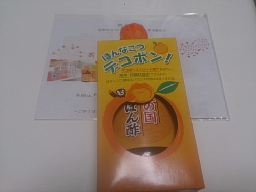 今回はホシサシさんからの デコポン!火の国ポン酢を頂きました^^ くまもんの可愛いラベル♪ 程良い甘みと酸味で大変美味しく頂きました! 九州熊本は今年の夏に旅行にも行った場所次回は絶対お土産でも買いたいなと思いました♪ 続きを見る