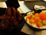 _blank">ソウル旅行!弘大のピカソ通りへ♪ の続きです弘大に来た1番の目的は友人が旅本で見つけたパンケーキのお店へ行くことです前回行けなかったので今回は絶対!!と意気込んで迷いながら到着したのにまさかの、、、閉まってる閉店ではなさそうだけど定休日でもないのに休みでしたガックリってことでパンケーキの代わりにパッピンスを食べることにしました 弘大の駅の近くにあるcocobruniというチョコレート屋さんのカフェへ ピンスの種類が3種類くらいしかなくて わたしはチョコレート専門店なので左のチョコレート友人は右の柿このチョコレートのピンスは本当にチョコレートずくしで氷もチョコレートでチョコレートのスライスがどっさりかかってて板チョコものっかってて、チョコレートシロップもかかっててチョコレート味のマカロンまで!!きっと恐ろしいカロリーだと思われます友人の注文した柿のピンスは恐ろしく美味しかったそうです わたしも味見させてもらったけど口の中がチョコレートでマヒしてしまってあんまり味が分かりませんでしたではホテルへ戻って夜ご飯でーす
