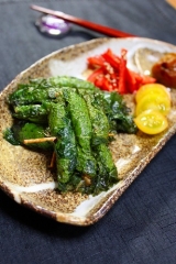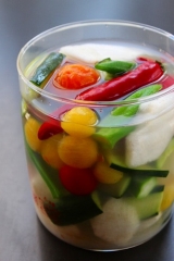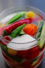 何となく秋の気配が漂い始めましたが 初秋の秋の味覚、梨が届きました 梨を見ると頭に浮かぶのが白菜キムチ キムチを漬ける時には梨をすりおろして漬けこみダレのヤンニョムに入れます 今年の春に【韓国とうがらし】の苗の名前を見て 思わず買ってしまった、たった1本の苗が立派に育ち こんな韓国唐辛子が収穫出来ました 画像だと大きさがわからないのですが 手を大きく広げたくらいの長さがあります 辛さは生のままだと思ったより辛く 乾燥したらもう少し辛さが柔らかくなるのかな〜 日本の唐辛子よりはやや辛みが柔らかい感じ 梨と韓国唐辛子が揃ったところで ニンニク生姜と塩でさっぱりと漬けこむ水キムチ 漬けこみ液は少しとろみをつける為に 白玉粉を入れて火にかけてとろみをつけたものに具材を入れます オクラミニトマトきゅうり梨 あっ 真ん中の橙色は柿かオレンジの様に見えますがトマトです すぐに冷蔵庫に入れずに半日位常温に置いてから 冷蔵庫で冷やした方が美味しいです 梨とオクラが好評でした ピクルスもいいけど たまにはこんな水キムチも美味しいですよ〜 漬けこみ液は1カップにつき小さじ1の塩を入れます 具材の量に合わせてかぶる位の水分で作ります 【梨と野菜の水キムチ★★★レシピ★★★】 材料 3〜4人分 漬け汁 水 3カップ 塩 小さじ3 白玉粉 小さじ1と1/2 A にんにく 1片 薄切り 生姜 1片 薄切り 胡瓜 1本〜2本 (塩(分量外)をかけてしんなりさせておく) ミニトマト 10個位 (適量皮を剥いて置く) 梨 1個 いちょう切り オクラ 5本位 (適量 さっとゆでておく) 韓国唐辛子 普通の唐辛子でも良い ?白玉粉に分量の水を少し入れて溶かしてから水と塩を入れて火にかけ沸騰したら1分位混ぜながらとろみをつける火を止め冷ます ?Aの材料を容器に入れて1の漬け汁を注ぎ入れる半日位常温に置いてから冷蔵庫に入れて冷たく冷やして頂く 励みになりますので【Ctrlキー】を押しながらポチポチ2カ所お願いします にほんブログ村 ↓ ↓ ↓ レシピブログに参加中♪ からだにとってもいい!「ここさち 毎日えごま油」モニター10名募集 続きを見る ['close']