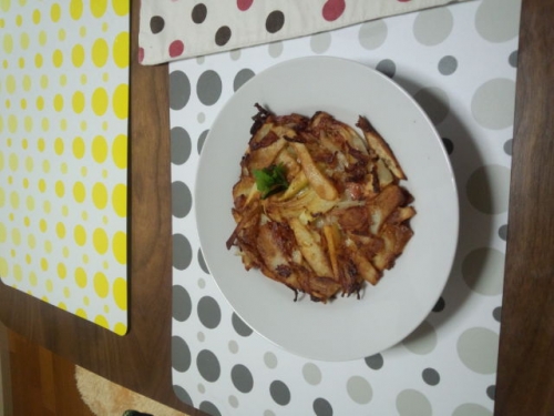 薄切りのジャガイモとベーコンを混ぜて、オリーブオイルに浸しておきます その際にハーブも入れます フライパンにオリーブオイルを引いて、薄く伸ばして 両面やいて、ハーブを添えます 簡単で、美味しいです