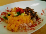 あのね、ふつうのそぼろご飯をつくる予定やったん とりの挽き肉と卵とあれば、いんげんで でもとりあえず冷蔵庫の掃除もかねてなすときゅうりとトマトが追加 そしたらめっちゃおしゃれになっちゃった なすは小さめにきって鶏肉と一緒にフライパンで炒めます 酒、砂糖、醤油で味付けをします 卵は塩と砂糖を加えて混ぜ、炒り卵を作ります トマトときゅうりはコロコロ状に切ります お皿にご飯をのせ、挽き肉 続きを見る ['close']