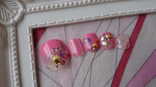 元気なネオンピンク×涼し気なクリアカラーをベースに、夏モチーフのパーツやストーンを乗せてポップな夏ネイルに仕上げました♡