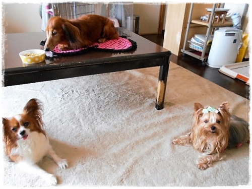 一番上の子のお迎え記念日、特別待遇でテーブル上で記念撮影、お祝いのおやつを前に伏せのコマンドで…テーブル下の2わんもおやつ欲しさに忠実に伏せをしておりました(笑)